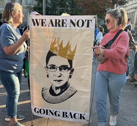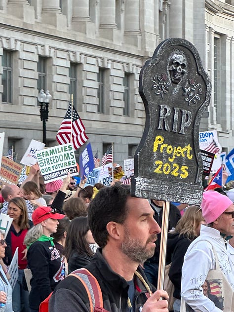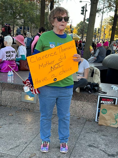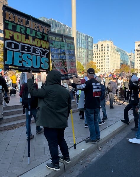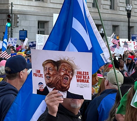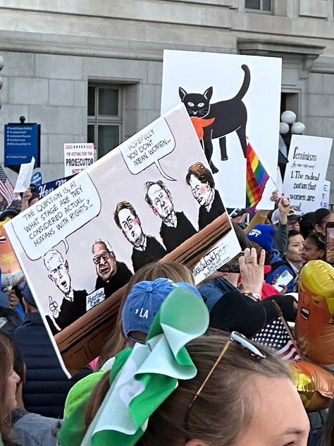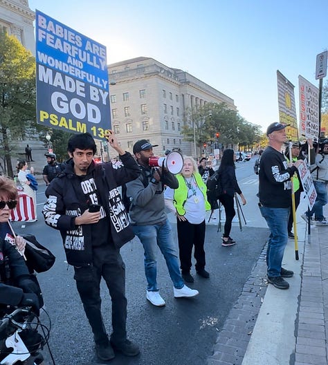 A sign identified his posse as the Progressive Anti-Abortion Uprising, an organization “committed,” per their website, “to the progressive feminist values of equality, non-violence, and nondiscrimination through an anti-capitalist lens.” Aside from abortion, their positions are so aggressively, blaringly leftwing that I can’t help wondering if they’re a conservative psyop. The site features a land acknowledgement and is riddled with KendiAngelonian social justice jargon. Their Instagram makes clear that they oppose the “genocide” in Gaza as much as the “genocide in the womb.”