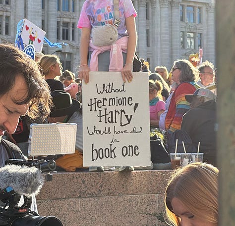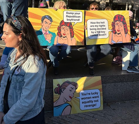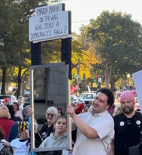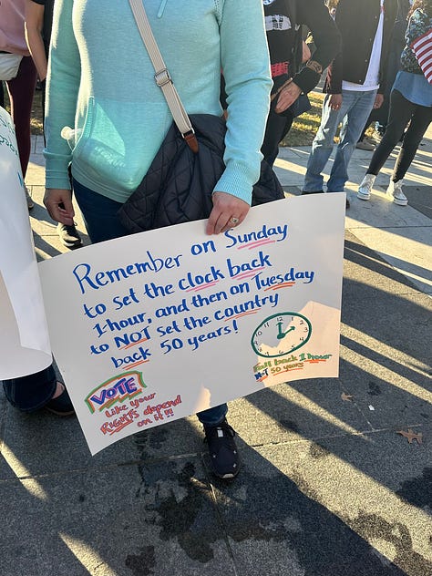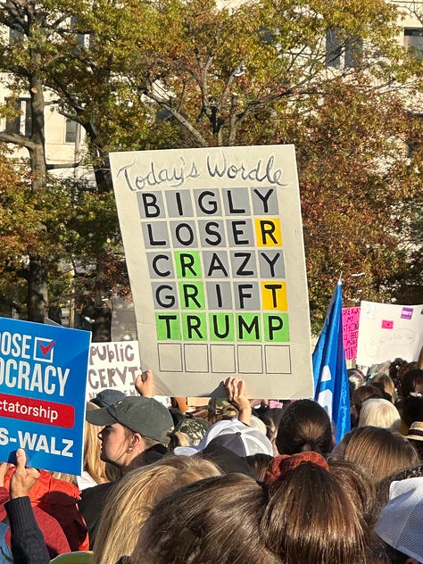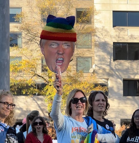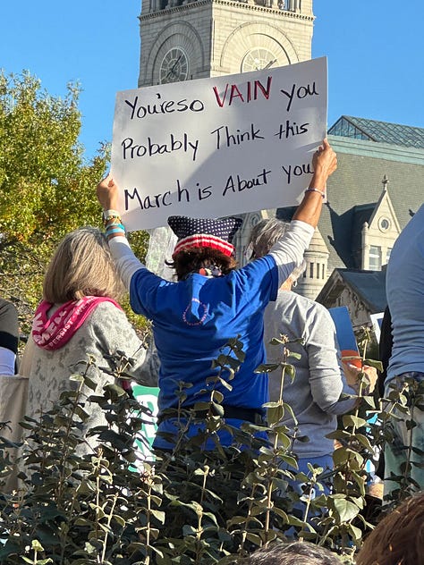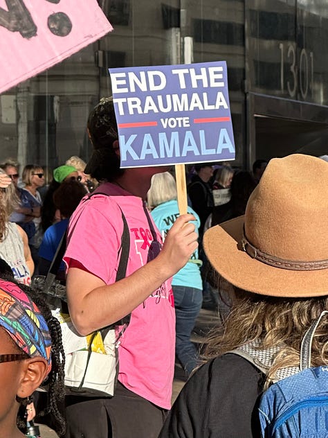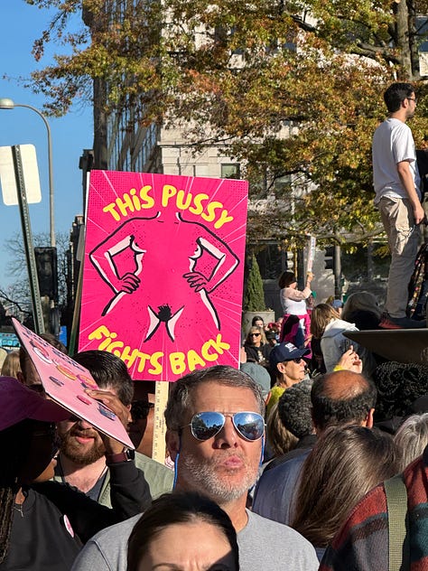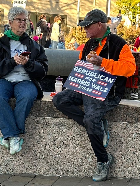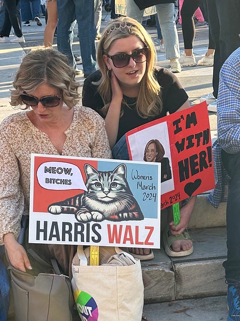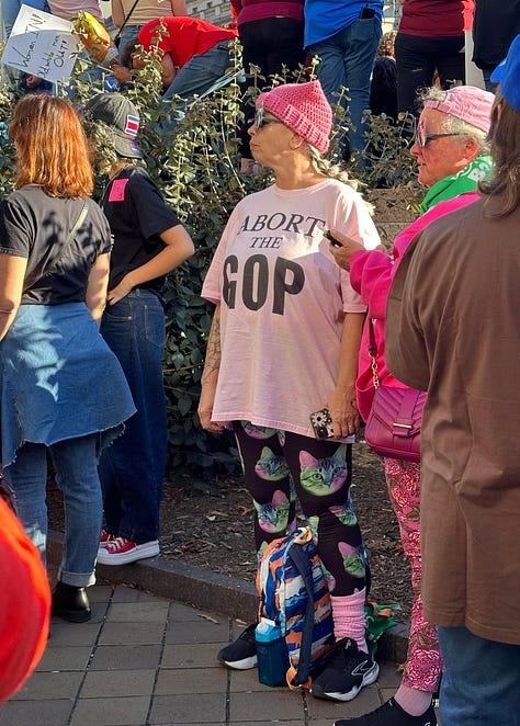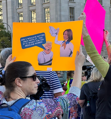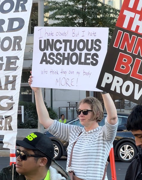 A woman in her sixties wearing a pink pussy hat—Samantha, let’s call her—approached and struck a confrontational pose, leaning forward, right hand raised and jabbing the air to emphasize her words. In her left she held a sign: “MIND YOUR OWN DAMN BUSINESS - HARRIS WALZ 2024.” She commenced to scream at Michael, her face contorted with rage. The endless rattle of a nearby noisemaker provided a harrowing soundtrack for the showdown.