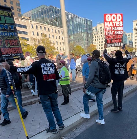 Halfway around the plaza, I let the procession proceed without me. Here was another Christian group, apparently unaffiliated with jumpsuit jailhouse Jesus. Their signs were a bit more inflammatory, the rhetoric of their spokesman, who I’ll call Michael, more focused on sin than love.