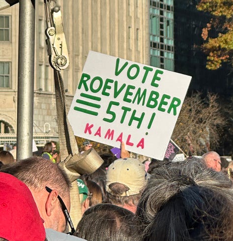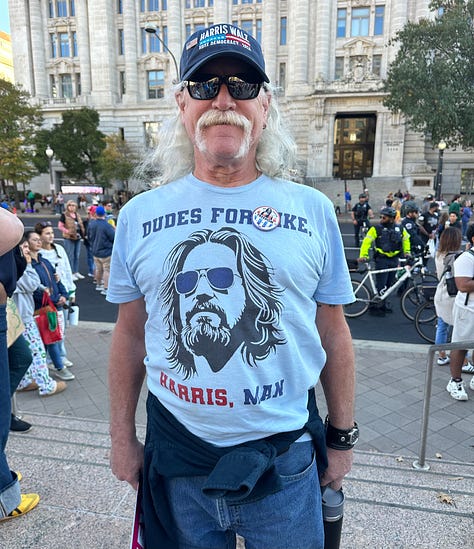 He repeated this four or five times until a nearby volunteer, clearly embarrassed by her uncouth ally, tried to usher him off the sidewalk into the plaza. “I’m pro-choice!” he assured her. “I’m for Kamala.” She smiled and nodded, looking uncomfortable.