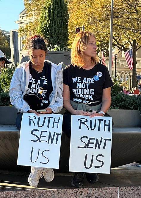 A knot of sign-toting pro-choice protestors stood nearby but kept to themselves. As a woman walked past with a boom mic I understood why things were quieter here: a significant number of the people around me were journalists. They had also noticed the perfect mirror effect created by the declining late afternoon sun in the puddles of fake blood. Photographers with big expensive cameras kneeled by a large puddle to get a shot of the inverted bystanders captured in the shimmering red-dyed corn syrup.