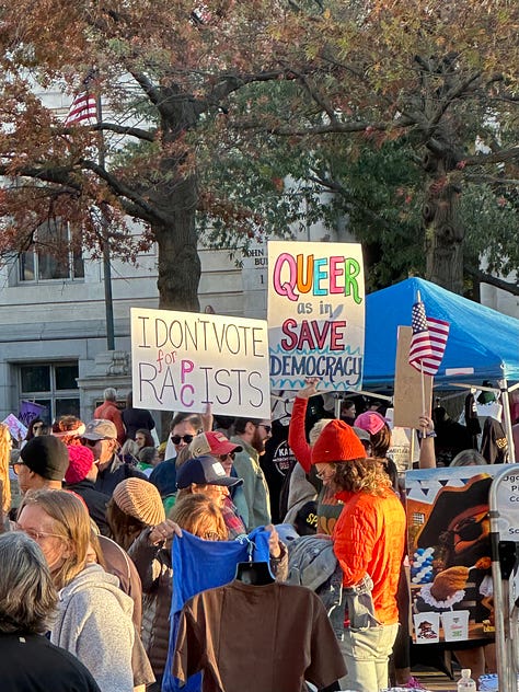 I didn’t mean to attend a political rally—it’s not the kind of thing I generally do on purpose. When I drove into DC on the Saturday afternoon before the election, I intended to go to the National Gallery of Art, where the only sign of politics is the occasional placard apologizing to museum patrons for an artist’s centuries-old transgression of woke orthodoxy. But as I walked down 14th Street there were signs that, in retrospect, seem to have been foretelling the coming chaos and rage.